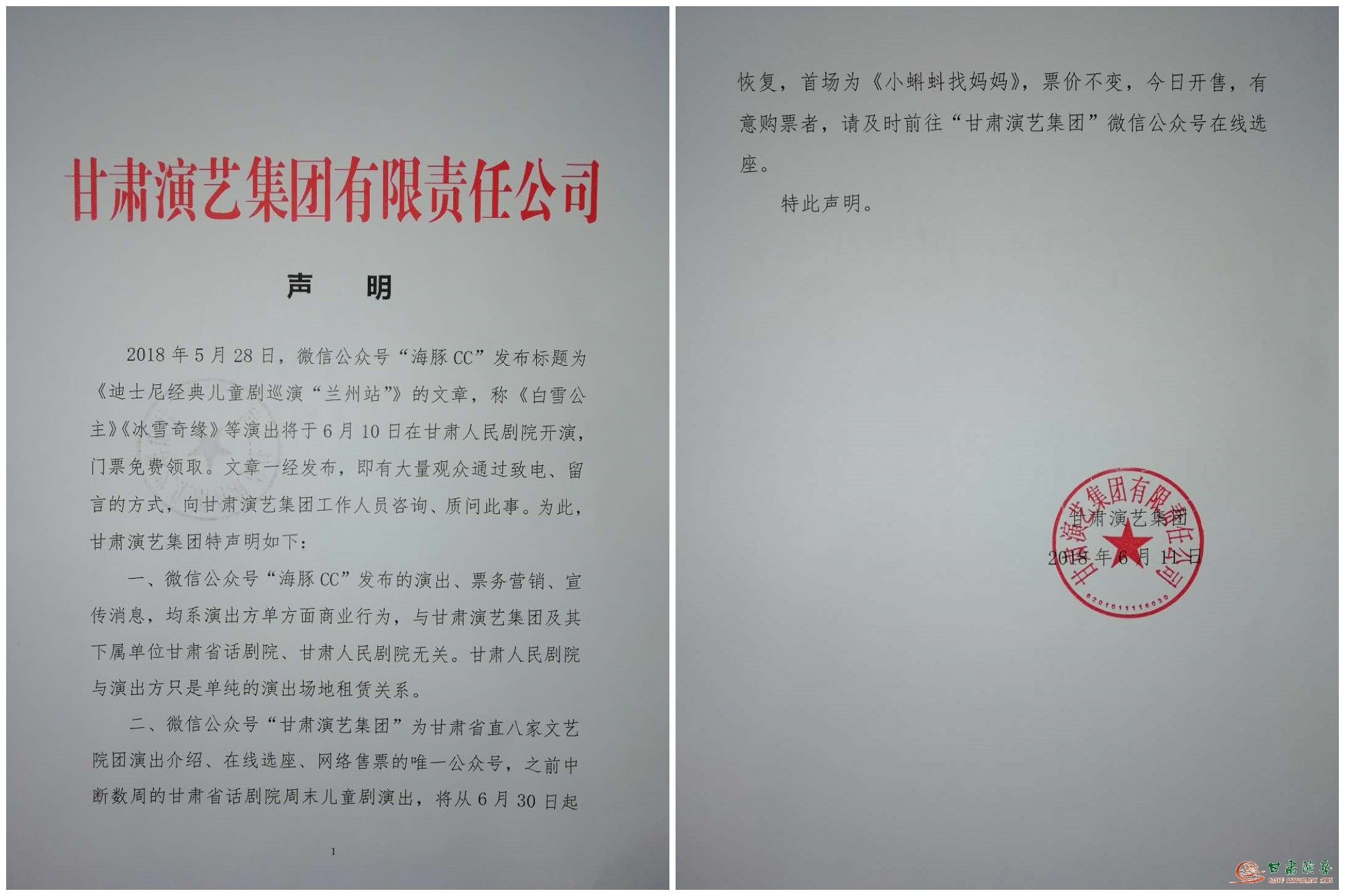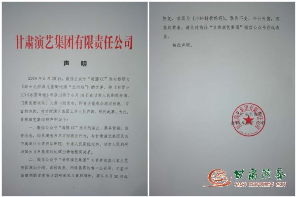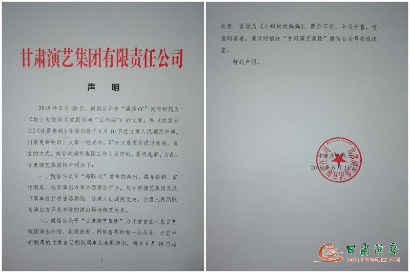 2018年5月28日,微信公眾號“海豚CC”發(fā)布標(biāo)題為《迪士尼經(jīng)典兒童劇巡演“蘭州站”》的文章,稱《白雪公主》《冰雪奇緣》等演出將于6月10日在甘肅人民劇院開演,門票免費(fèi)領(lǐng)取。文章一經(jīng)發(fā)布,即有大量觀眾通過致電、留言的方式,向甘肅演藝集團(tuán)工作人員咨詢、質(zhì)問此事。為此,甘肅演藝集團(tuán)特聲明如下: