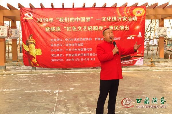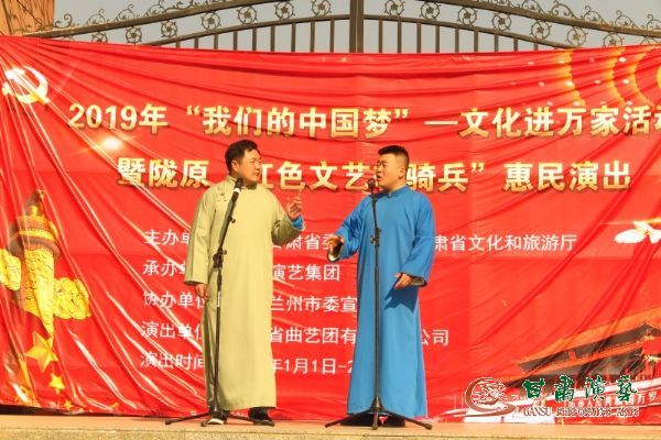 1月21日-22日由中共甘肅省委宣傳部、甘肅省文化和旅游廳主辦,甘肅演藝集團(tuán)承辦,中共蘭州市委宣傳部協(xié)辦,甘肅省曲藝團(tuán)有限責(zé)任公司作為演出單位的2019年“我們的中國夢”文化進(jìn)萬家暨隴原“紅色文藝輕騎兵”惠民演出活動走進(jìn)蘭州市青白石上坪村、安寧區(qū)和榆中縣城,用精彩的曲藝節(jié)目為群眾送去新春祝福,帶去黨和政府的關(guān)懷。