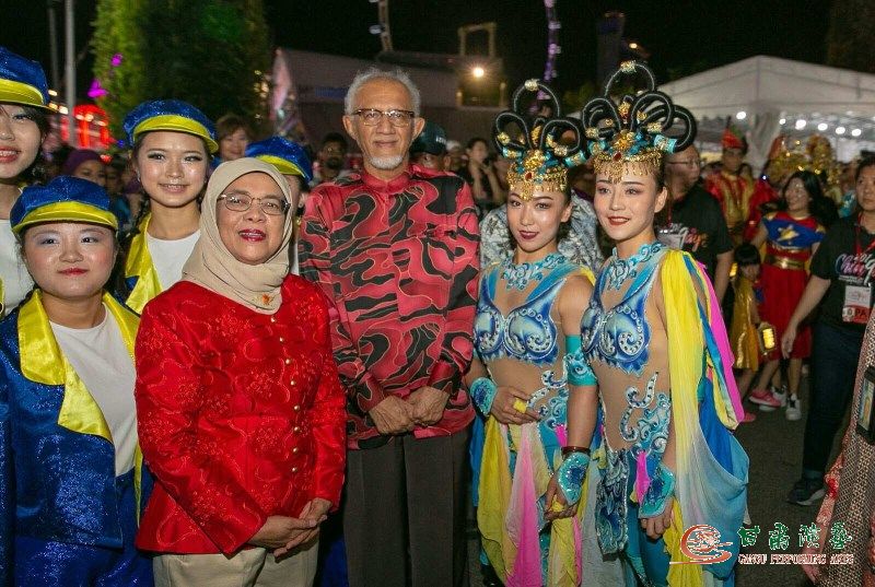 特別是在同17個國家參與的“2019妝藝大游行”的6場演出中,雜技團(tuán)以獨(dú)具魅力的敦煌“飛天”形象,通過“肩上芭蕾”“抖空竹”“轉(zhuǎn)花蝶”等技藝高難、婀娜多姿、輕盈飄逸、節(jié)奏明快的表現(xiàn)形式,展現(xiàn)了極具民族地域特色的雜技節(jié)目,贏得了出席“2019妝藝大游行”新加坡總統(tǒng)哈莉瑪·雅各布、總理李顯龍先生等新加坡國家政要和現(xiàn)場5萬余名觀眾的熱烈歡迎和喝彩。每逢雜技團(tuán)的節(jié)目入場,活動主持人都會激動地重復(fù)“China GanSu perfect ”(來自中國甘肅的完美表演 ),演出現(xiàn)場激情更加高漲。新加坡總統(tǒng)哈莉瑪·雅各布、總理李顯龍觀看演出后,與演員親切握手交談,給予雜技團(tuán)演出隊(duì)伍高度評價,并與演職人員合影留念,印證了中新的友好交往,留下了中新友好交往的歷史畫面。